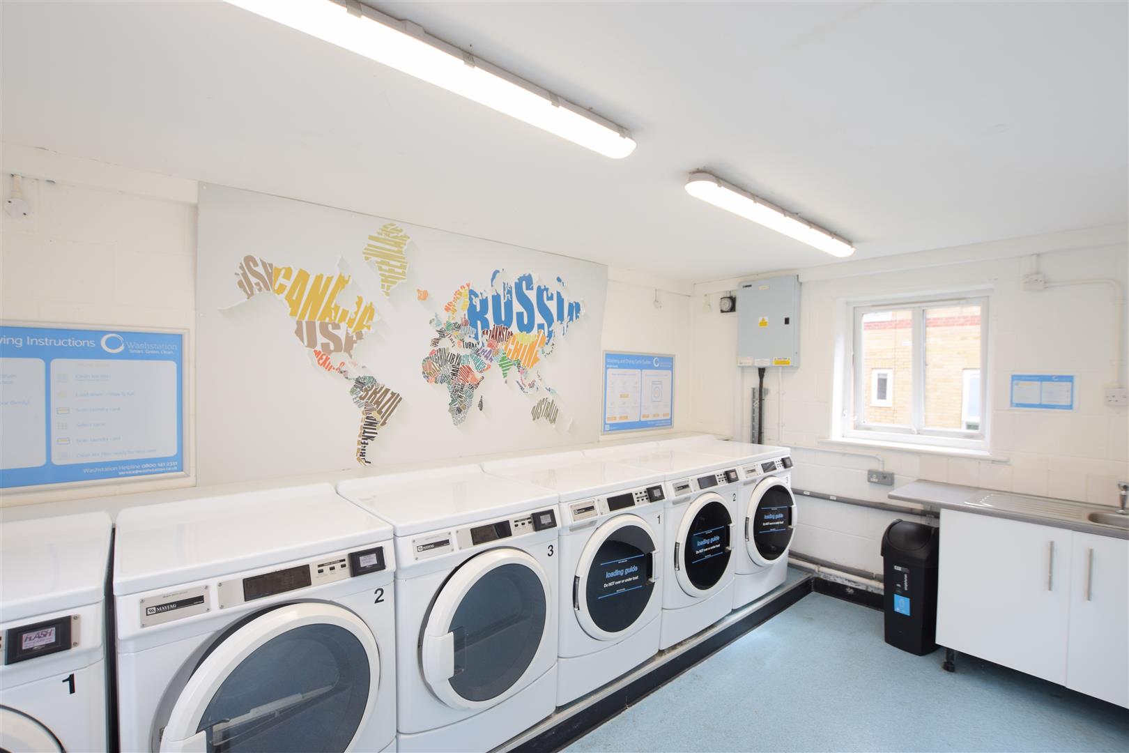 It features a communal laundry room with washers and dryers. Top up cards are used for payment via Washstation, an external laundry service.