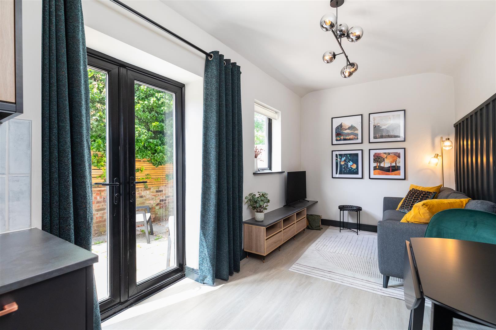 The apartment has been designed with luxury in mind, right down the the smallest detail. The ground floor has an entrance hall with floor length mirror, a shower room, and open plan kitchen with induction hob, living, and dining area, which features French doors that open onto a private enclosed patio area.