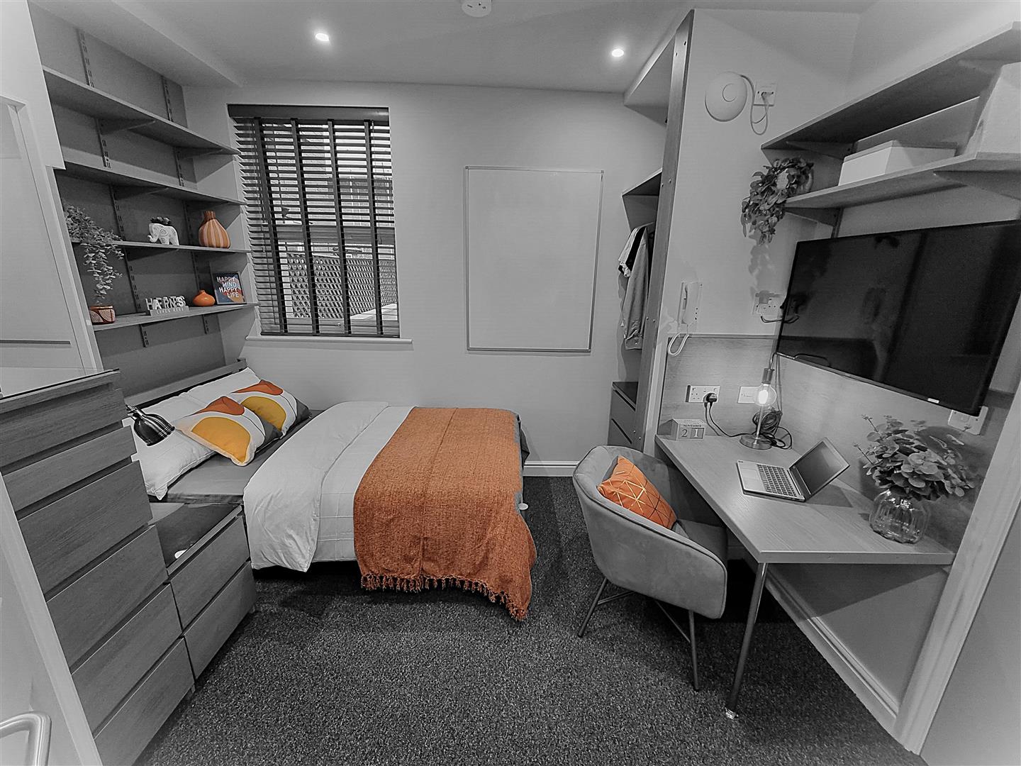 Furnished with bed, chest, shelves, and clothes storage, plus TV and work station with seating.