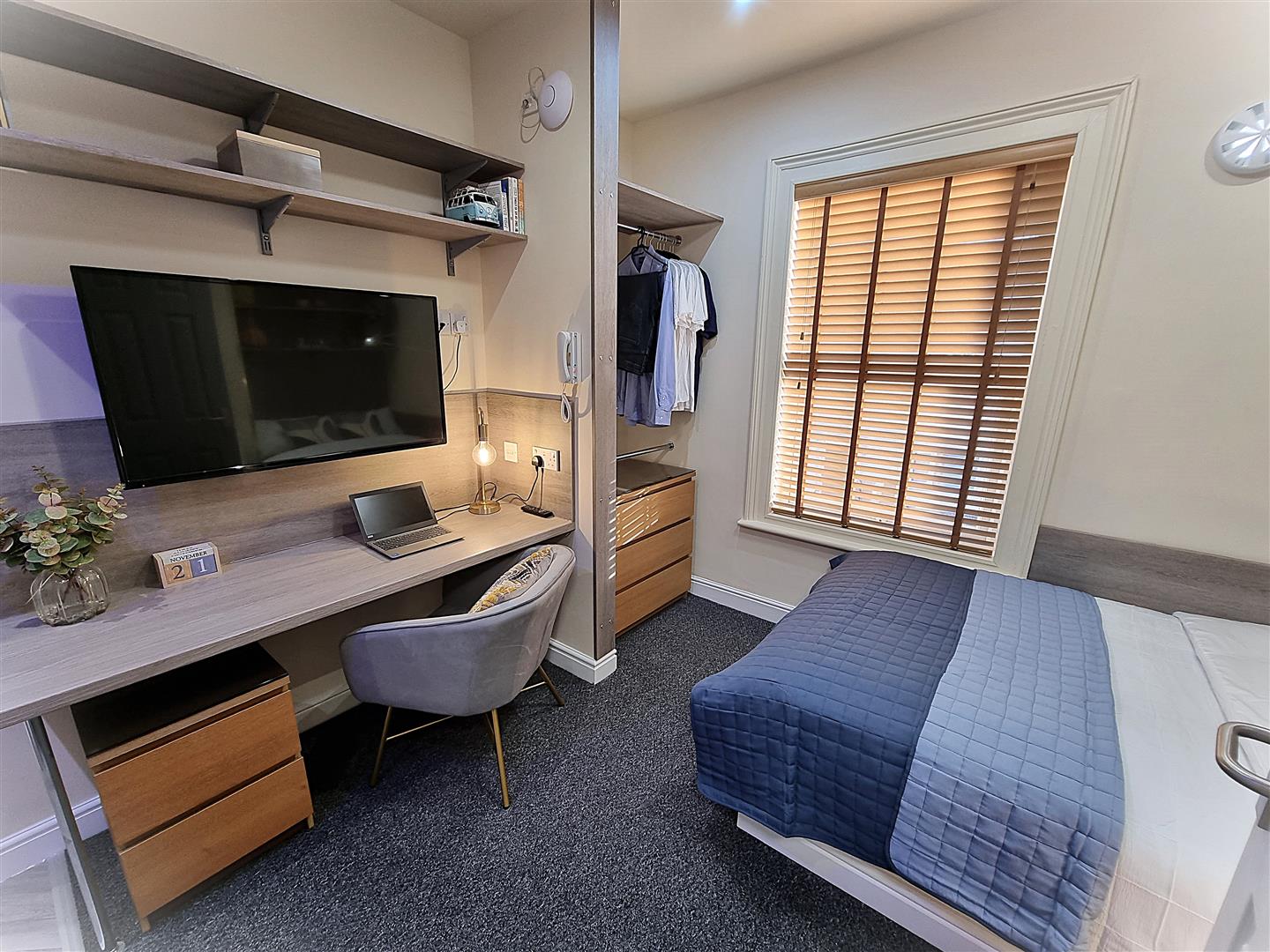 Furnished with bed, chest, shelves, and clothes storage, plus TV and work station with seating.
