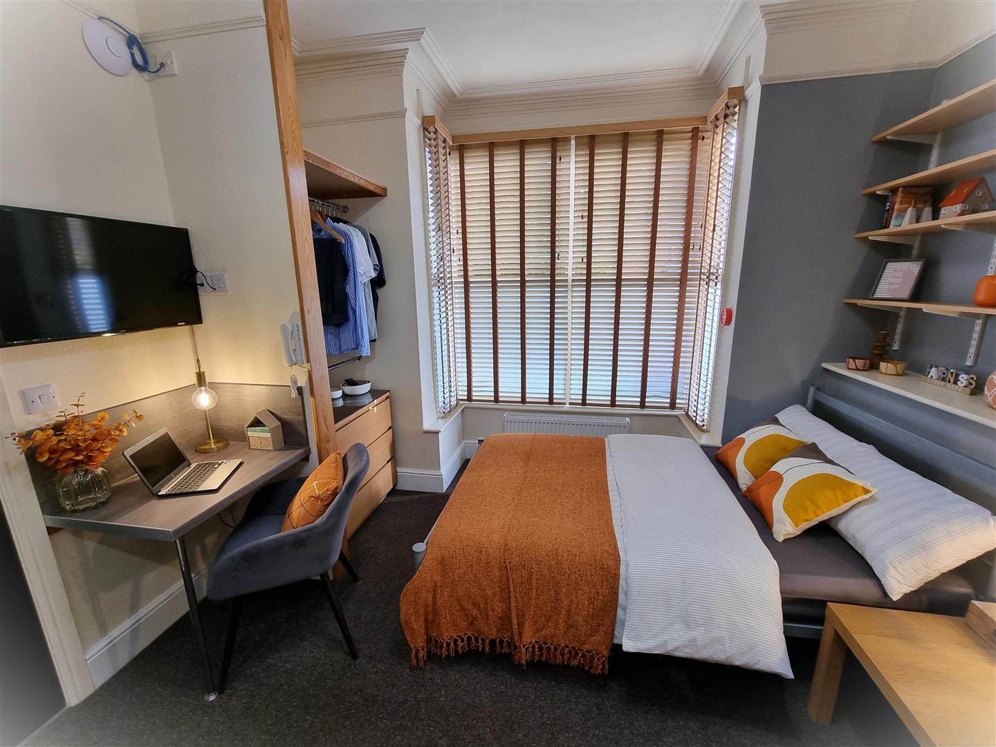 Furnished with bed, chest, shelves, and clothes storage, plus TV and work station with seating.