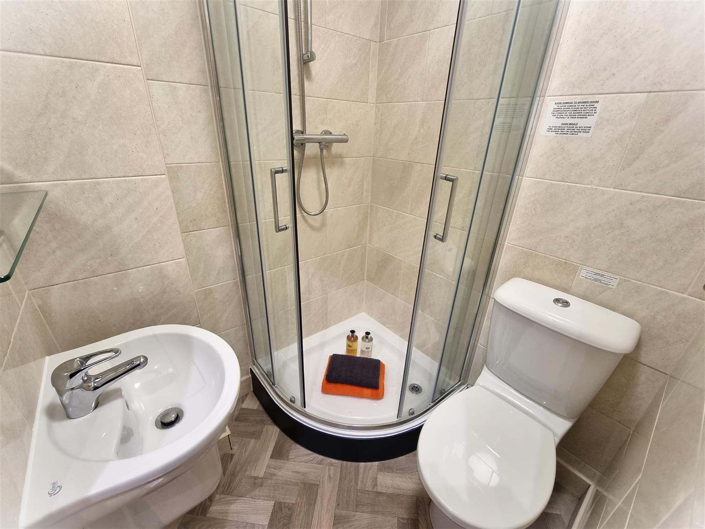 Private en-suite with shower, basin and WC.