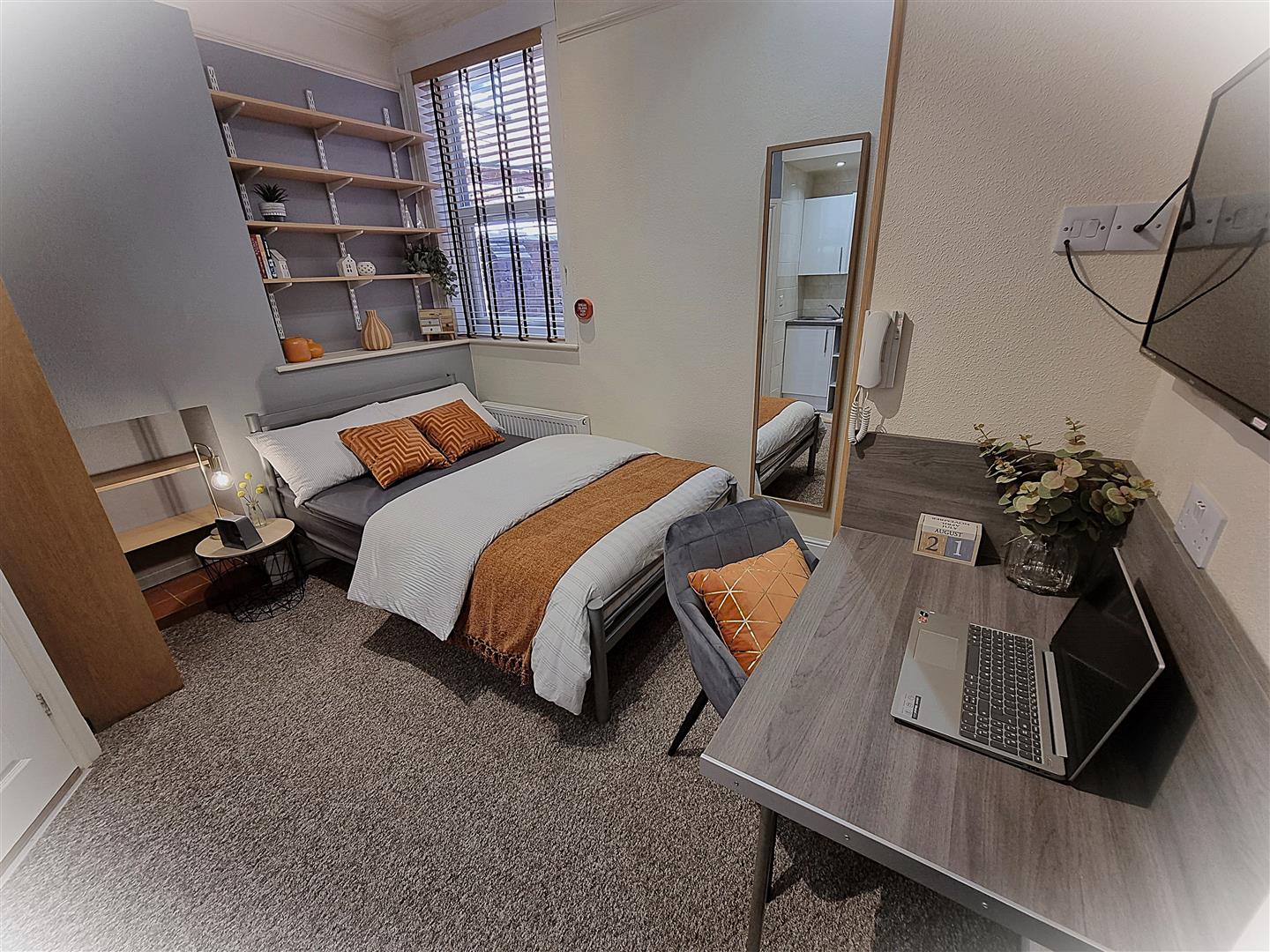 Furnished with bed, chest, shelves, and clothes storage, plus TV and work station with seating.