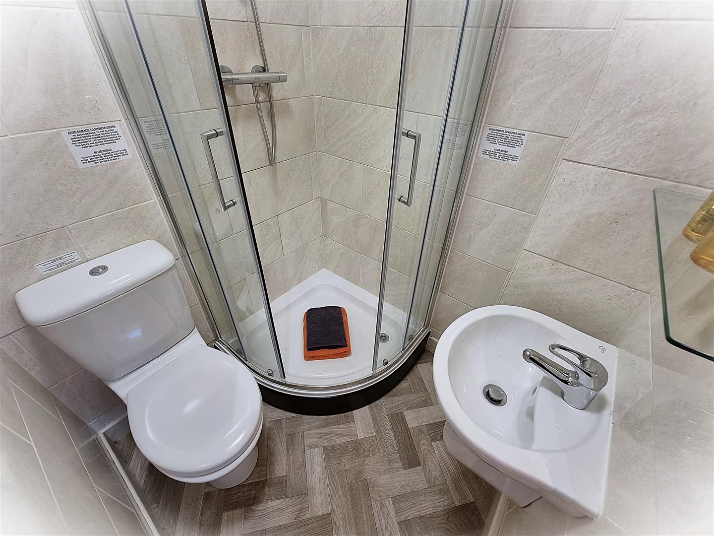 Private en-suite with shower, basin and WC.