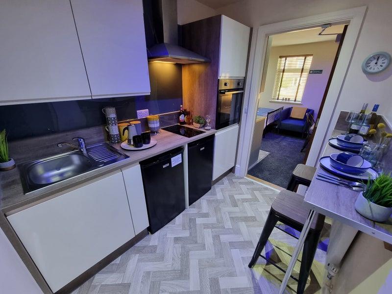 Private separate kitchen with oven, hob, microwave, fridge freezer, kettle, toaster and sink.